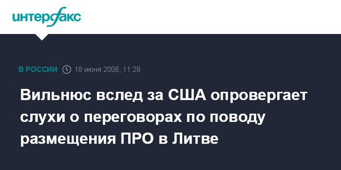 Вильнюс. 18 июня. INTERFAX.RU - Литва не ведет переговоров о размещении на своей территории элементов противоракетной обороны США, заявила "Интерфаксу" директор департамента информации и печати МИД Литвы Виолета Гайжаускайте.