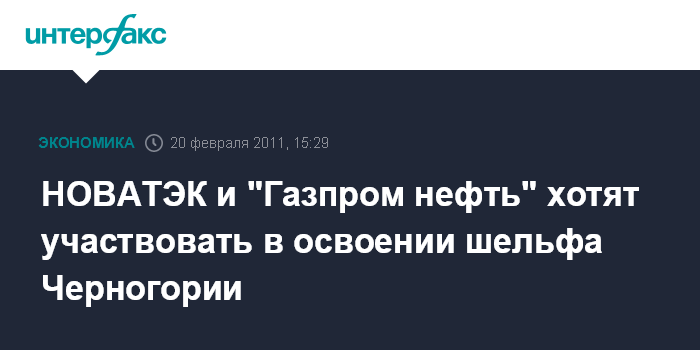 Москва. 20 февраля. INTERFAX.RU - ОАО "НОВАТЭК" и сербская NIS (51% принадлежит "Газпром нефти") в числе крупнейших европейских компаний выразили заинтересованность участвовать в освоении шельфа Черногории. Как говорится в сообщении министерства экономики Черногории, эти компании выразили заинтересованность стать участником концессионного соглашения по освоению углеводородов шельфа Черногории. Интерес также выразили французская Total, итальянская Eni, норвежская Statoil, итальянская Edison и другие.