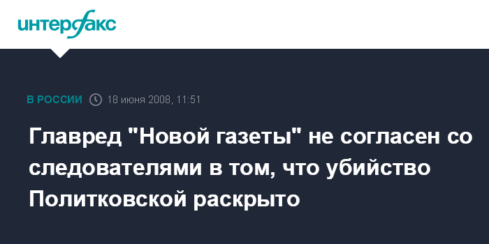 "Мы по-прежнему считаем, что следствие на правильном пути. Сделано действительно много, но интерпретировать это как окончание расследования и раскрытие преступления нельзя. Убийца все еще находится на свободе, а заказчик не определен", - сказал Муратов "Интерфаксу", комментируя заявление Следственного комитета при прокуратуре РФ.