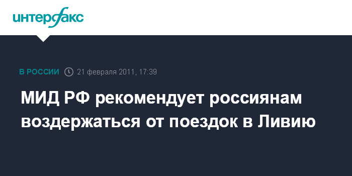 Москва. 21 февраля. INTERFAX.RU - МИД РФ советует россиянам воздержаться от поездок в Ливию.