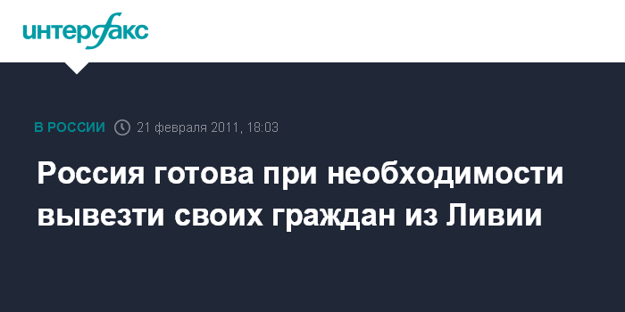 Москва. 21 февраля. INTERFAX.RU - Власти России готовы обеспечить эвакуацию граждан РФ из охваченной беспорядками Ливии, если в этом возникнет необходимость.