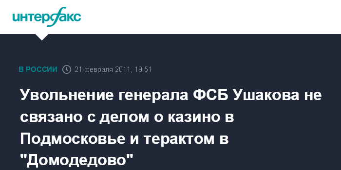 Москва. 21 февраля. INTERFAX.RU - Увольнение генерал-полковника Вячеслава Ушакова, занимавшего должность заместителя директора ФСБ РФ, не связано с так называемым делом о незаконном игорном бизнесе в Подмосковье и терактом в аэропорту "Домодедово".