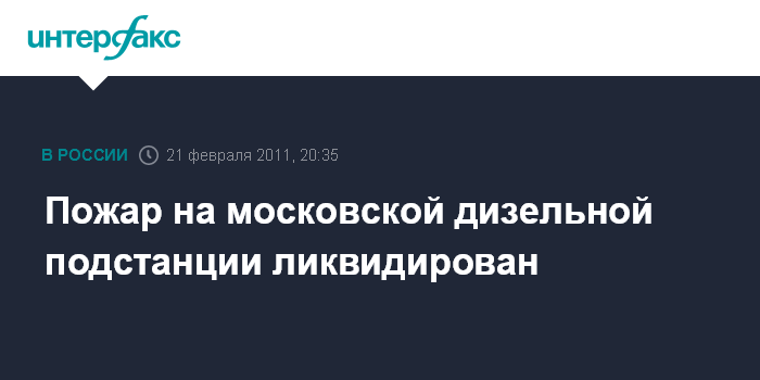 Москва. 21 февраля. INTERFAX.RU - Ликвидирован пожар на дизельной подстанции на северо-востоке Москвы, сообщил "Интерфаксу" начальник пресс-службы ГУ МЧС по Москве Евгений Бобылев.