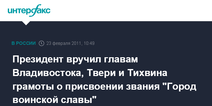 Москва. 23 февраля. INTERFAX.RU - Торжественная церемония присвоения звания "Город воинской славы" Владивостоку, Твери и Тихвину состоялась в среду в Кремле. В День защитника Отечества президент РФ Дмитрий Медведев вручил главам трех российских городов грамоты о присвоении этого почетного звания. Соответствующий указ был подписан президентом также в праздничный день - 4 ноября 2010, когда в России отмечают День народного единства.