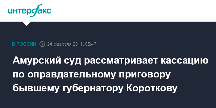 Благовещенск. 24 февраля. ИНТЕРФАКС-ДАЛЬНИЙ ВОСТОК - Амурский областной суд приступил к рассмотрению кассационного представления областной прокуратуры, не согласившейся с оправдательным приговором в отношении бывшего губернатора Приамурья Леонида Короткова.