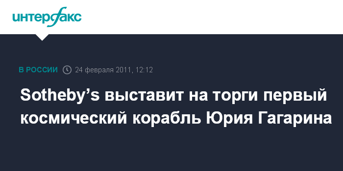 Москва. 24 февраля. INTERFAX.RU - Аукционный дом Sotheby’s выставит на торги космический корабль-спутник "Восток 3КА-2", на котором 50 лет назад в космос полетел Юрий Гагарин. В пресс-релизе Sotheby’s говорится, что аукцион состоится 12 апреля в Нью-Йорке в галерее York Avenue Sotheby’s.
