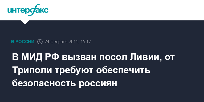 Москва. 24 февраля. INTERFAX.RU - Посол Ливии в Москве был в четверг вызван в МИД РФ, где ему было заявлено о необходимости обеспечить безопасность россиян, находящихся в этой стране.