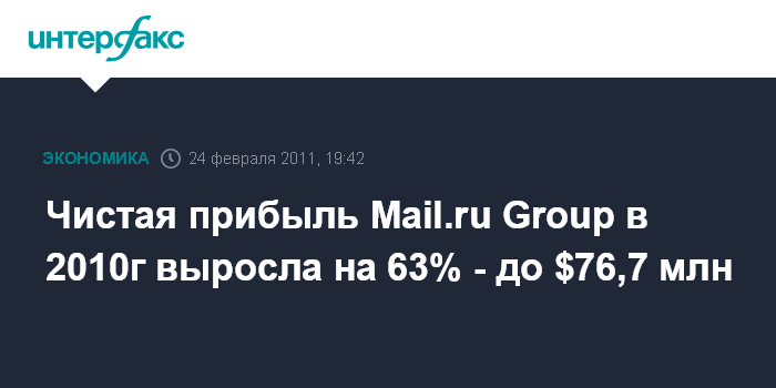 Москва. 24 февраля. INTERFAX.RU - Чистая прибыль Mail.ru Group по итогам 2010 года выросла на 63% по сравнению с 2009 г. и составила $76,7 млн, говорится в сообщении компании.
