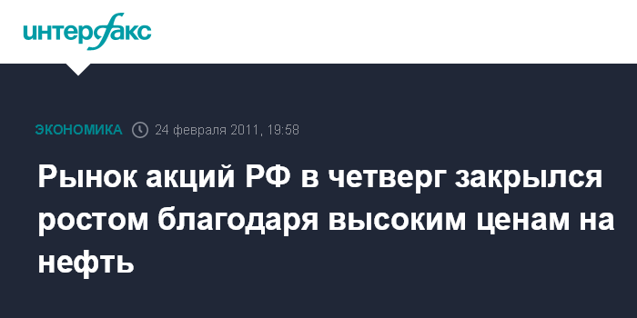 Москва. 24 февраля. INTERFAX.RU - Российский рынок акций, который демонстрировал в четверг лучшую динамику по сравнению с другими рынками, падавшими под влиянием дестабилизации ситуации на Ближнем Востоке и Северной Африке, закрылся заметным ростом благодаря высоким мировым ценам на нефть и позитивной статистике в США.