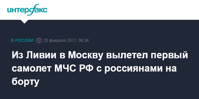 Москва. 25 февраля. ИНТЕРФАКС - В Москву из ливийского города Сирт вылетел первый борт МЧС РФ с эвакуированными россиянами, сообщает управление информации МЧС РФ.