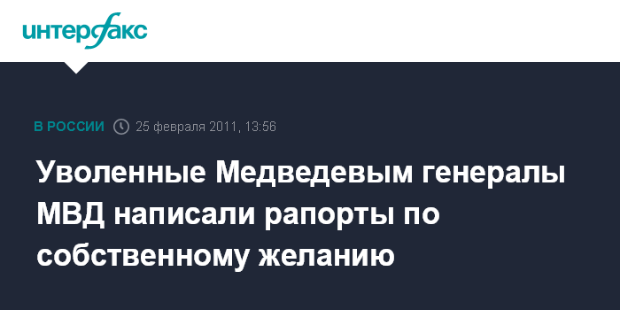 Москва. 25 февраля. INTERFAX.RU - Генералы и офицеры МВД, которые были освобождены от занимаемых должностей указом президента РФ Дмитрия Медведева в пятницу, написали заявление об уходе по собственному желанию.