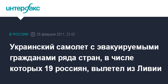 Киев. 25 февраля. ИНТЕРФАКС-УКРАИНА - Самолет с эвакуируемыми из Ливии гражданами ряда стран на борту вылетел из Триполи на Украину.