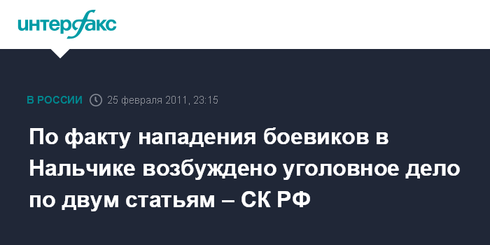 Нальчик. 25 февраля. ИНТЕРФАКС-ЮГ – В Кабардино-Балкарии возбуждено уголовное дело по факту обстрела боевиками ряда объектов правоохранительных органов, сообщили агентству "Интерфакс-Юг" в Следственном управлении Следственного комитета РФ по республике.