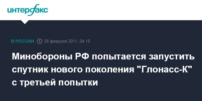 Минобороны РФ попытается запустить спутник нового поколения "Глонасс-К" с третьей попытки