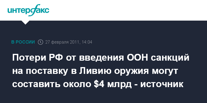 Потери РФ от введения ООН санкций на поставку в Ливию оружия могут составить около $4 млрд - источник
