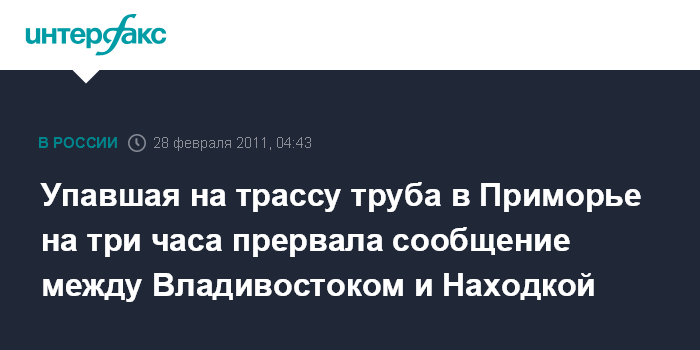 Владивосток. 28 февраля. ИНТЕРФАКС-ДАЛЬНИЙ ВОСТОК - Около трех часов понадобилось строителям газопровода в Приморье, чтобы убрать с трассы Владивосток - Находка скатившуюся на нее 60-метровую трубу.