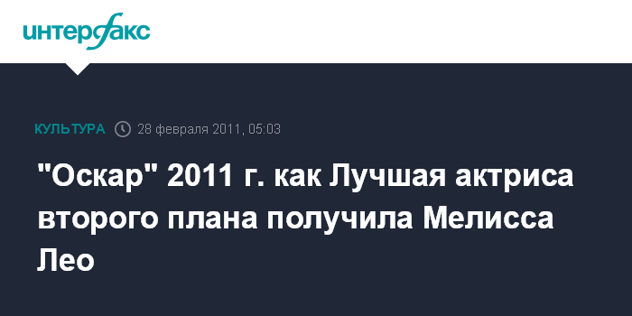 Москва. 28 февраля. INTERFAX.RU – Актрисе Мелиссе Лео присужден "Оскар" 2011 г. за лучшее исполнение женской роли второго плана в фильме "Боец".