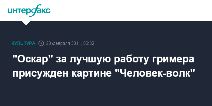 Москва. 28 февраля. INTERFAX.RU - "Оскар" в номинации Лучший грим в 2011 г. достался фильму "Человек-волк".