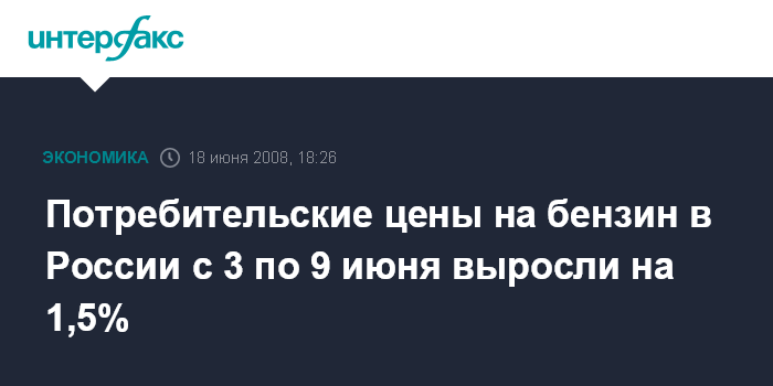 Москва. 18 июня. INTERFAX.RU - Потребительские цены на автомобильный бензин в среднем по России с 3 по 8 июня выросли на 1,5%, сообщила Федеральная служба государственной статистики РФ (Росстат).
