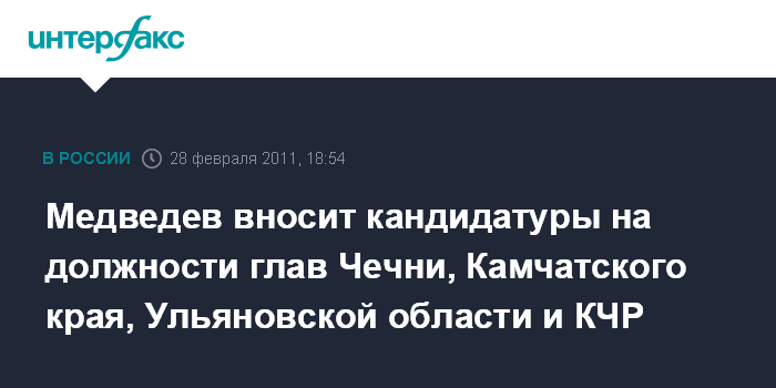 Медведев вносит кандидатуры на должности глав Чечни, Камчатского края, Ульяновской области и КЧР
