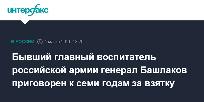 Москва. 1 марта. INTERFAX.RU - Военный суд в Москве приговорил к семи годам лишения свободы бывшего начальника Главного управления воспитательной работы Вооруженных сил РФ генерал-лейтенанта запаса Анатолия Башлакова.