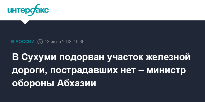 Сухуми. 18 июня. ИНТЕРФАКС - В Сухуми взорван участок железной дороги, заявил "Интерфаксу" министр обороны Абхазии Мираб Кишмария.