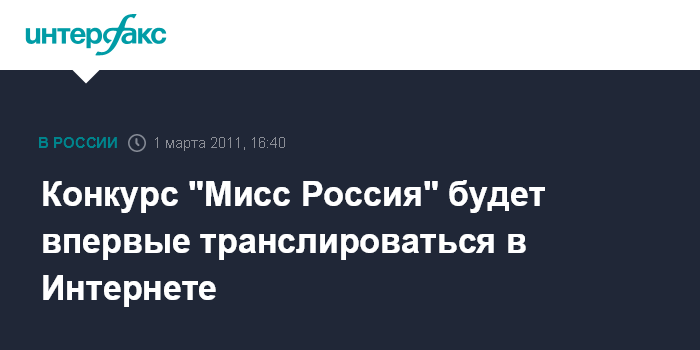 Москва. 1 марта. INTERFAX.RU - В этом году конкурс "Мисс Россия" будет впервые транслироваться в интернете, и любой желающий сможет отправить SMS за понравившуюся участницу, сообщила на пресс-конференции во вторник директор национального конкурса "Мисс Россия" Лариса Тихонова.