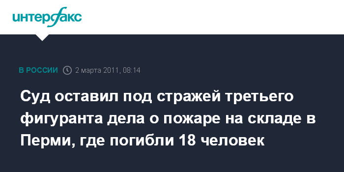 Пермь. 2 марта. ИНТЕРФАКС-ПОВОЛЖЬЕ - Пермский краевой суд рассмотрел ходатайство защиты обвиняемого по делу о крупном пожаре на пермском складе на решение Ленинского райсуда Перми об аресте.