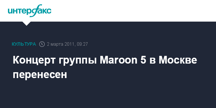 Москва. 2 марта. INTERFAX.RU – Американская группа Maroon 5 перенесла свой концерт в Москве, который должен был состояться 20 марта в Крокус Сити Холле на последние выходные ноября, точная дата выступления пока не названа, сообщили interfax.ru организаторы мероприятия.