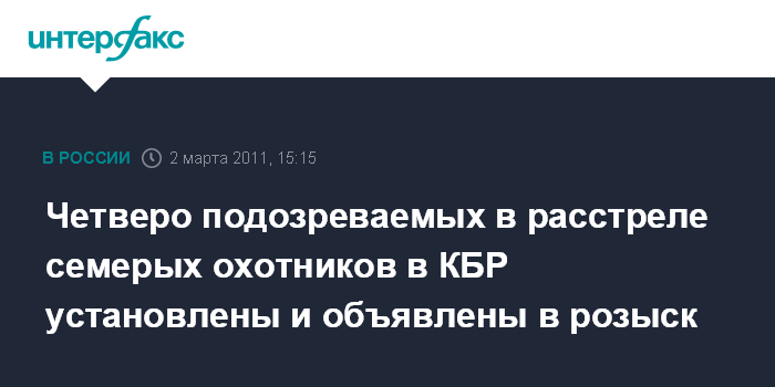 Москва. 2 марта. INTERFAX.RU - Следствие установило личности четверых подозреваемых в убийстве семерых охотников в окрестностях города Баксана (Кабардино-Балкария) в декабре прошлого года, сообщил официальный представитель Следственного комитета РФ Владимир Маркин.