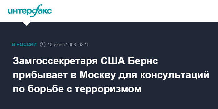 Замгоссекретаря США Бернс прибывает в Москву для консультаций по борьбе с терроризмом