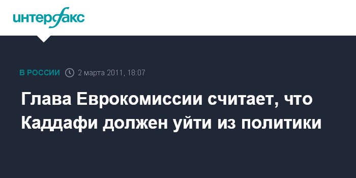 Брюссель. 2 марта. INTERFAX.RU - Председатель Европейской комиссии Жозе Мануэл Баррозу заявил в среду в Брюсселе, что настало время для ухода лидера ливийского режима Муамара Каддафи с политической сцены.