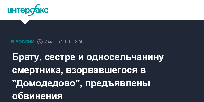 "Задержанным ранее брату и сестре смертника, совершившего теракт в аэропорту "Домодедово", Ахмеду и Фатиме Евлоевым, а также односельчанину террориста Умару Аушеву предъявлены обвинения по ст.205 (терроризм), ст.209 (бандитизм), ст.222 (незаконный оборот оружия и боеприпасов) и ст.223 (изготовление оружия) УК РФ", - сказал собеседник агентства.