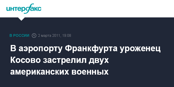 Берлин. 2 марта. INTERFAX.RU - Уроженец Косово открыл огонь из огнестрельного оружия на территории аэропорта немецкого города Франкфурта, в результате чего два человека погибли и еще двое ранены, сообщило в среду агентство ЭФЭ.