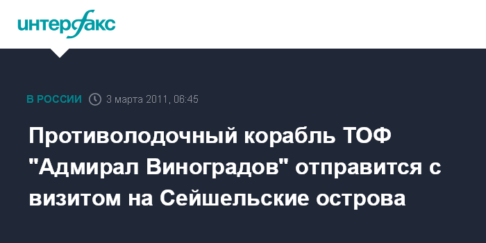 Владивосток. 3 марта. ИНТЕРФАКС-ДАЛЬНИЙ ВОСТОК - Отряд кораблей Тихоокеанского флота (ТОФ) во главе с большим противолодочным кораблем "Адмирал Виноградов" в рамках международной деятельности флота 4 марта совершит плановый деловой заход в столицу Сейшельских островов порт Виктория.