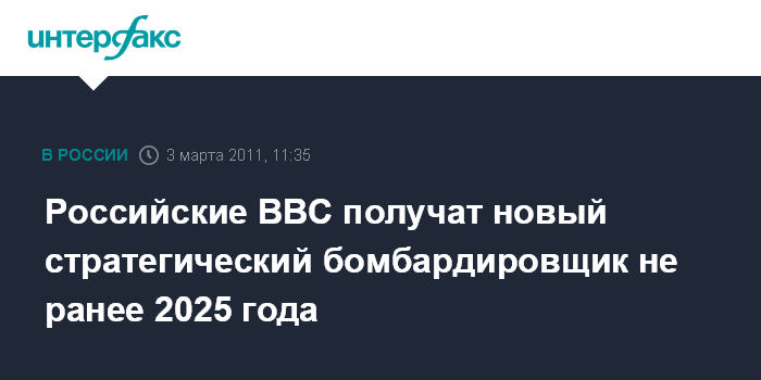 Москва. 3 марта. INTERFAX.RU - Стратегический бомбардировщик нового поколения, в официальных документах он имеет наименование перспективный авиационный комплекс Дальней авиации (ПАК ДА), будет построен не ранее 2025 года, сообщил "Интерфаксу" в четверг источник в российском авиапроме.