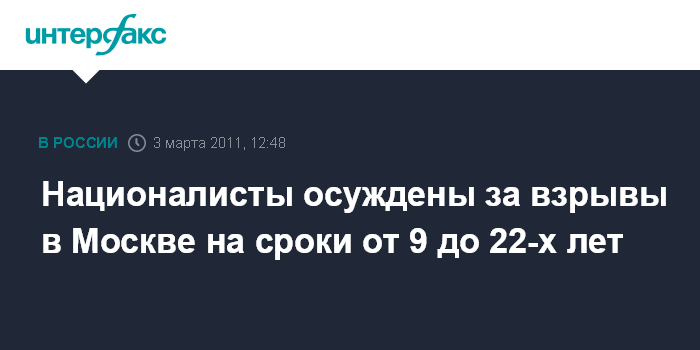 Москва. 3 марта. INTERFAX.RU - Мосгорсуд приговорил в четверг четверых скинхедов, признанных виновными в организации взрывов в Москве в 2008 году, к срокам от девяти до 22-х лет лишения свободы.