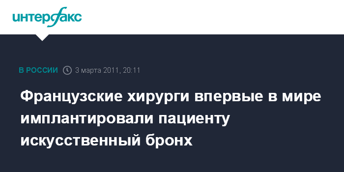 Париж. 3 марта. INTERFAX.RU - Французские врачи успешно провели первую в мире операцию по имплантации онкологическому больному искусственного бронха, сообщает в четверг местная радиостанция "Эроп-1".