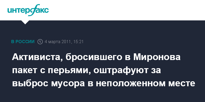 Активиста, бросившего в Миронова пакет с перьями, оштрафуют за выброс мусора в неположенном месте