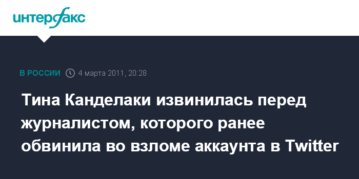 Москва. 4 марта. INTERFAX.RU – Телеведущая Тина Канделаки принесла извинения журналисту радио "Свобода" Мумину Шакирову, которого ранее обвинила во взломе своего аккаунта в Twitter-e.