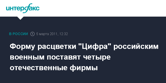 Согласно единому реестру госконтрактов, контракты на поставку зимних полевых костюмов камуфлированной расцветки "Цифра" заключены с московским ЗАО "Униформ-Центр" и питерским ОАО "БТК групп". Летнюю полевую форму поставят "БТК групп", а также ООО КШФ "Инициатива" (г.Кизел Пермский Край) и ООО Коммерческая фирма "Красные Ткачи" (пос.Красные Ткачи, Ярославская область).