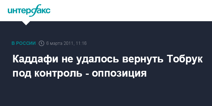 Лондон/Париж. 6 марта. INTERFAX.RU - Верным ливийскому лидеру Муамару Каддафи войскам не удалось захватить город Тобрук, заявили в воскресенье сторонники оппозиции. По сообщению телерадиокорпорации Би-Би-Си, оппозиционеры заверили, что по-прежнему полностью контролируют этот город на востоке Ливии. Ранее ливийское государственное телевидение сообщило, что войскам якобы удалось выбить оппозицию из городов Эз-Завия, Рас-Лануф, Мисурата и из Тобрука.
