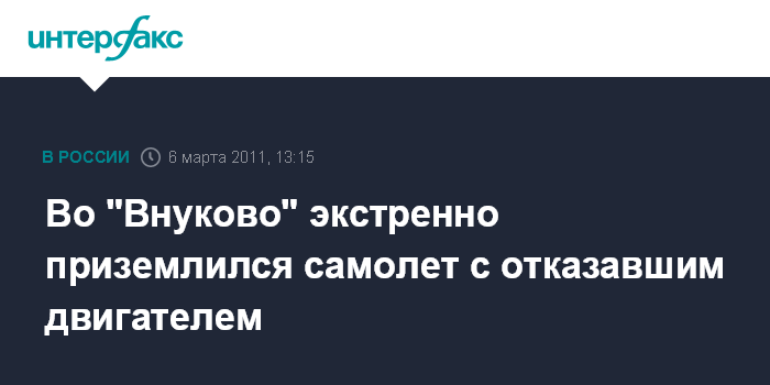 Посадка прошла удачно. Перед приземлением самолета аварийно-спасательные службы "Внуково" были приведены в состояние повышенной готовности, отметил источник. "В результате инцидента никто не пострадал. В ближайшее время будут установлены причины отказа двигателя", - сказал собеседник агентства.