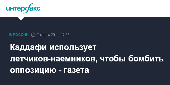 Лондон. 7 марта. INTERFAX.RU - Ливийские самолеты, которые атакуют оппозиционеров, пилотируются экипажами из Сирии, Алжира, Украины, Сербии и Румынии, сообщает в понедельник издающаяся в Лондоне межарабская газета "Аш-Шарк аль-Аусат" со ссылкой на источники в кругах оппозиции. Собеседники газеты сообщили, что ливийским ВВС пришлось прибегнуть к услугам иностранных пилотов из-за большого количества отказов ливийских летчиков, не желающих выполнять приказы и совершать налеты на оппозиционеров.