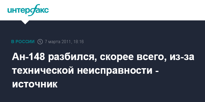 Москва. 7 марта. INTERFAX.RU - Техническая неисправность, скорее всего, стала причиной крушения самолета Ан-148 в Белгородской области, сообщил в понедельник "Интерфаксу" источник в авиационных кругах. "Специалисты склоняются к выводу, что к крушению самолета привела его техническая неисправность", - отметил собеседник агентства. Самолет Ан-148 потерпел катастрофу 5 марта в Белгородской области. В результате погибли шесть человек, в том числе два гражданина Мьянмы.
