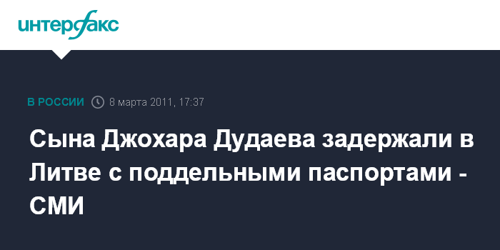 Вильнюс. 8 марта. ИНТЕРФАКС/BNS - В Каунасском районе Литвы на минувшей неделе был задержан сын Джохара Дудаева Деги Дудаев, сообщил сетевой новостной портал www.delfi.lt. 2 марта на дороге Вильнюс - Каунас сотрудники управления по оперативной деятельности Службы охраны госграницы Литвы (СОГГЛ) задержали автомобиль Audi A6 и его пассажира 27 лет. У пассажира было обнаружено семь поддельных паспортов граждан Литвы. Ранее о нем сообщалось, что это гражданин Грузии. По данным портала, это младший сын Джохара Дудаева Деги Дудаев.