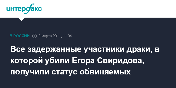 Москва. 9 марта. INTERFAX.RU - Последнему участнику драки, в которой в декабре был убит болельщик московского "Спартака" Егор Свиридов, предъявлено обвинение в хулиганстве и нанесении побоев, сообщил "Интерфаксу" официальный представитель СК РФ Владимир Маркин.