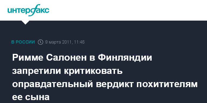 "Римме Салонен запретили критиковать в СМИ решение генеральной прокуратуры об отказе от предъявления обвинения похитителям ее сына Антона, а также рассказывать в своей предвыборной кампании о его похищении", - сообщил в среду "Интерфаксу" ее официальный представитель, председатель Антифашистского комитета Финляндии правозащитник Йохан Бекман (Johan Backman).