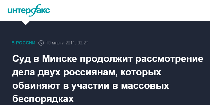 Минск. 10 марта. ИНТЕРФАКС-ЗАПАД - Судебное заседание по делу двух граждан РФ Артема Бреуса и Ивана Гапонова, обвиняемых в участии в массовых беспорядках в Минске, возобновится в четверг.