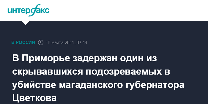 Владивосток. 10 марта. ИНТЕРФАКС - ДАЛЬНИЙ ВОСТОК - В Находке сотрудники УФСБ по Приморью задержали одного из подозреваемых в участии в убийстве губернатора Магаданской области Валентина Цветкова.